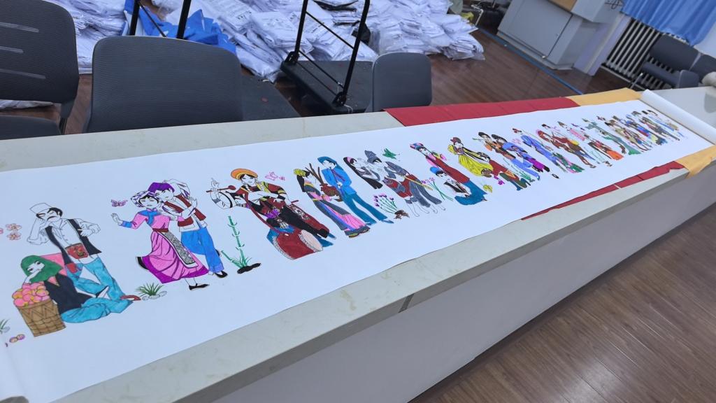 12月13日,黑龙江护理高等专科学校一幅名为“石榴花开结同心 携手共筑中国梦”的长篇绘画作品圆满完成。该作品由南岗校区、阿城校区、松北校区的同学们共同创作,汇聚了 17 个民族共 56 名同学的心血,包括蒙古族、满族、达斡尔族、壮族、鄂温克族、布依族等多个少数民族,充分展现了学校丰富的民族多样性与团结和谐的校园氛围。