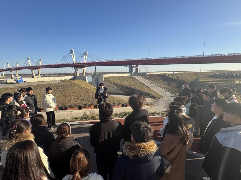 随后,活动队伍来到中俄黑龙江大桥。讲解员向大家详细介绍了大桥的建设历程、技术特点以及通车后的运营情况。作为中俄两国首座跨界江公路大桥,中俄黑龙江大桥于2022年正式通车,它不仅是连接中俄两国的重要交通枢纽,更是两国友好合作的象征,对推动黑河与俄罗斯布拉戈维申斯克市的经贸、文化、旅游等领域合作具有重要意义。在大桥观景平台,师生们远眺大桥全貌,只见白色的桥身横跨黑龙江两岸,让大家真切感受到了国家的基建实力和中俄合作的蓬勃活力。