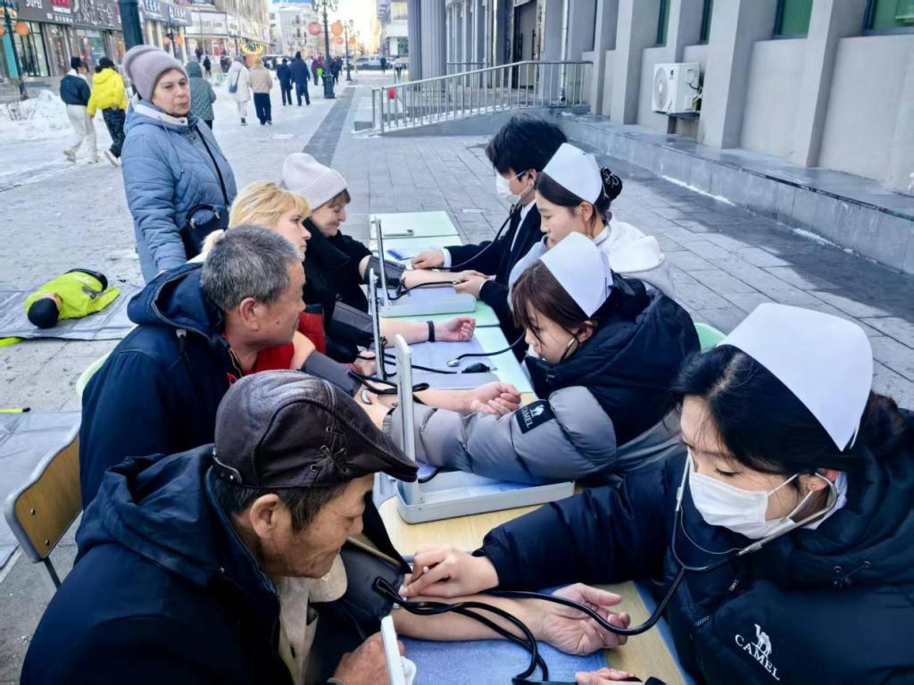 下午,由黑河校区40余名护理、康复专业的师生组成的志愿者队伍,奔赴黑河市中央路商业街开展“口岸健康医护行,雷锋精神暖边境”志愿服务活动。活动现场人气高涨,不仅吸引了周边居民、过往市民踊跃参与,不少往来口岸的俄罗斯游客也纷纷驻足体验。志愿者队伍分工明确、配合默契,严格遵循操作规范,为群众现场测量血压,并针对血压异常者给出个性化的健康建议;在心肺复苏展示区,志愿者们现场演示心肺复苏标准操作流程,让大家近距离学习实用的急救技能;健康宣传组的志愿者一边为群众发放健康防护知识传单,一边讲解常见慢性病预防、口岸出行健康防护、春季养生及个人卫生等知识。