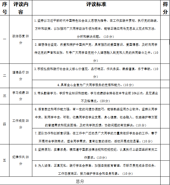 5、建立以服务和贡献为导向的激励机制,评价结果将作为学生会工作人员选拔任用的重要依据;学生会工作人员在评奖评优等事项时,将依据评议结果择优提名,不与其岗位简单直接挂钩。