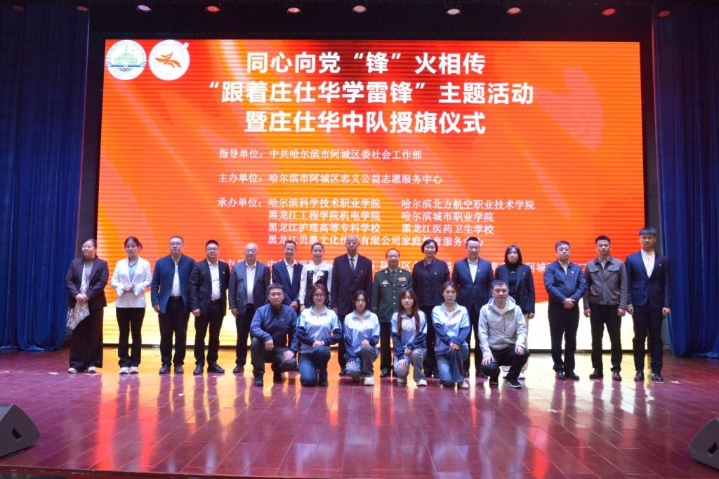 为深入学习贯彻习近平总书记关于学习和弘扬雷锋精神重要论述,充分发挥“当代雷锋”的榜样示范作用,4月24日,黑龙江护理高等专科学校副校长于沛君、团委负责人孙健飞等70余名师生参加了在哈尔滨科学技术职业学院举办的“同心向党 ‘锋’火相传——跟着庄仕华学雷锋”主题活动暨庄仕华中队授旗仪式。