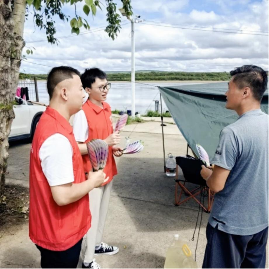 在文明实践与民生服务中,梅云辰的身影活跃在各个角落。他化身“旅游宣传员”,在黑龙江畔参与“以扇为媒”创新旅游宣传志愿服务,为外来游客发放“团团荐家乡”宣传扇与文明旅游倡议书,提供景区介绍、路线指引、美食推荐,还沿江畔捡拾垃圾,以“志愿红”助力“旅游热”;他争当“安全守护者”,参与“网络安全为人民 网络安全靠人民”宣传活动,向群众普及防诈骗与隐私保护知识;加入“珍爱生命,谨防溺水”安全宣传,通过发放传单、现场讲解演示,提升居民与青少年防溺水意识;参加“携手筑安全,青春献减灾”防灾减灾技能培训与志愿者应急技能专题培训,掌握止血包扎、心肺复苏等实用技能,为基层安全防护添砖加瓦。