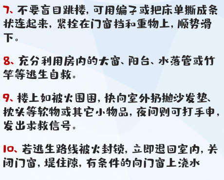 9、救火时门窗要慢开,以免空气对流加速火焰蔓延和火焰突然窜出伤人。